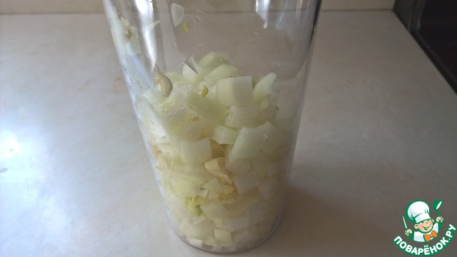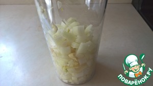 Выкладываем лук и чеснок в стакан блендера