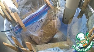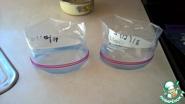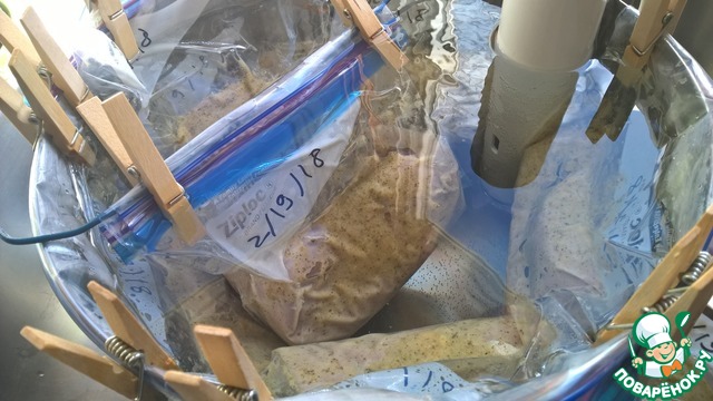 Закрываем зиплок пакеты почти до конца - оставив около 3 см, чтобы выходил воздух. Погружаем пакеты в воду, удерживая горловину над водой и даем воде выдавить воздух из пакета. После этого запечатывем пакеты до конца и закрепляем в кастрюле Су Вида - чтобы пакеты не утонули.