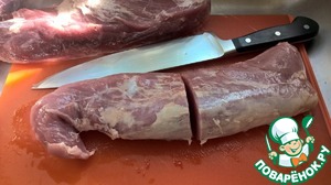 Разрезаем вырезку поперек пополам - так, чтобы куски были примерно одинаковы по весу