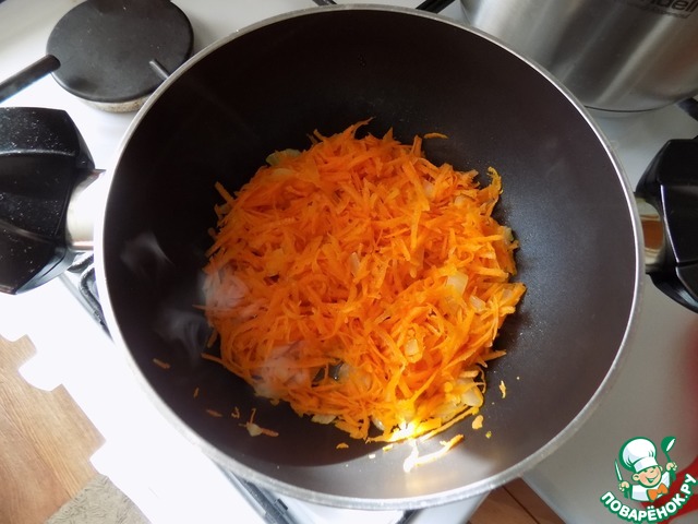 Берём для супа кастрюлю с толстым дном, где можно обжарить продукты и далее-варить суп. Наливаем масло, разогреваем его и выкладываем мелко резанный лук, золотим и к луку добавляем морковь, натёртую на средней тёрке. Томим под крышкой на маленьком огне пару минут.