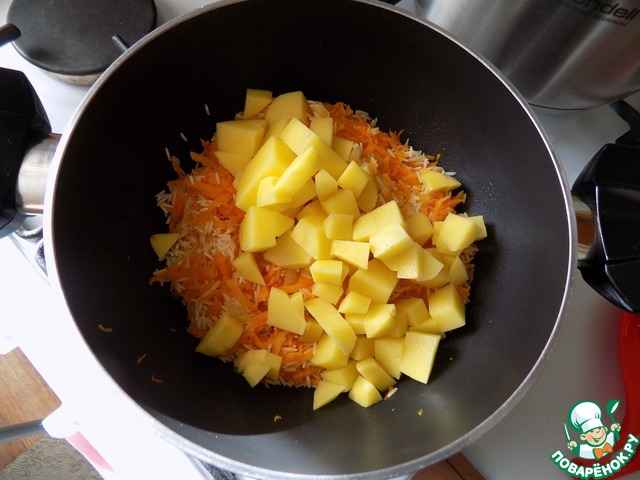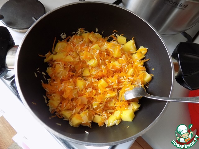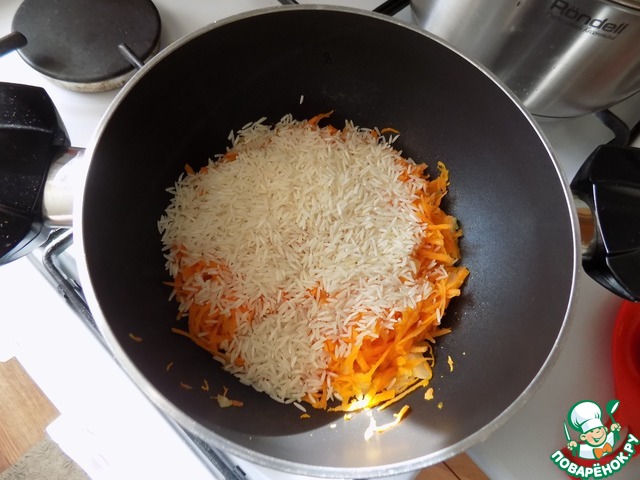 В кастрюлю отправляем рис. Перемешиваем и даём рису пропитаться.