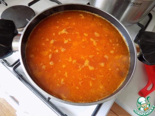 Нам нужно приготовить кипяток 1,5 л для заливки основы. Суп будет густой. Если вы хотите суп пожиже, то налейте 2 л кипятка. Доводим до кипения, огонь делаем на минимум, накрываем крышкой и варим до готовности риса. Это ещё минут 15.