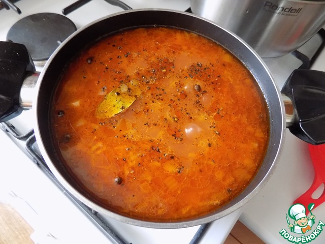 Выкладываем в готовый суп специи: кориандр молотый, корицу, душистый перец, лавровый лист и перчим свеже-молотым перцем. Перемешиваем и готовим ещё пару-тройку минут. Суп готов.