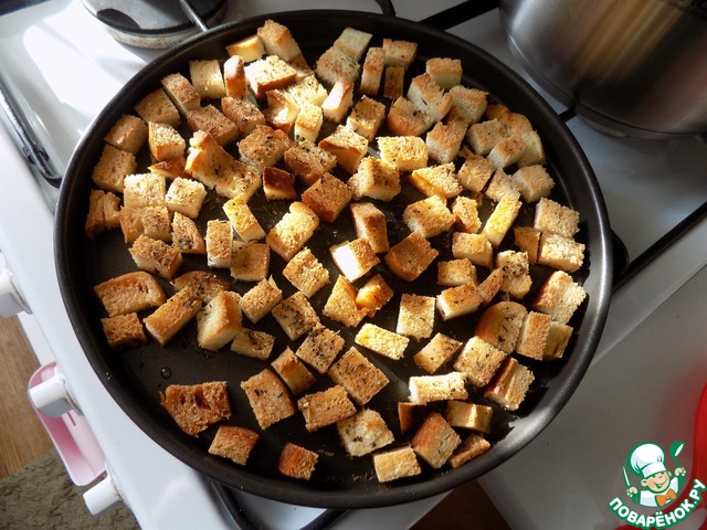Подаём суп, присыпав его сухариками. Сухарики ароматные и вкусные. Это дополнение к супу, можно их и не делать. Суп и без сухариков очень вкусный!