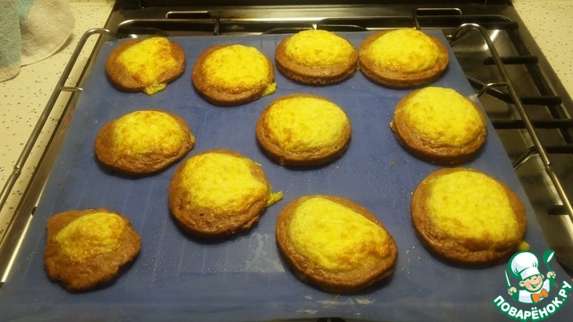 Лепешки смазать взбитым яйцом, посыпать сырной соломкой и отправить в разогретую до t180-190С духовку.