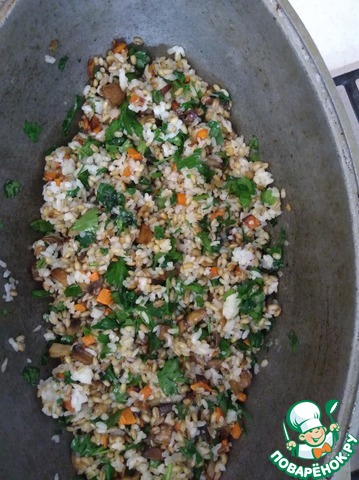 Перемешать всё в кастрюле рис, перловку, грибы с овощами, петрушку.