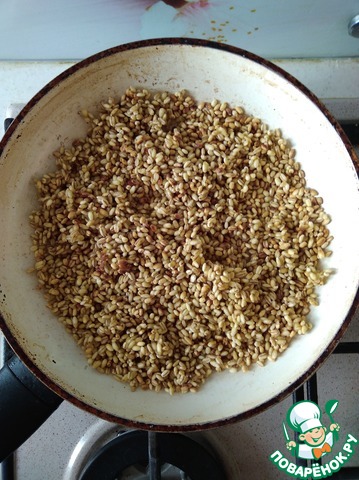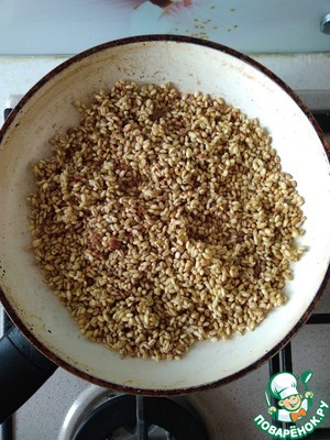 Перловую крупу обжарить до золотистого цвета. Добавить 1/2 стакана воды, соль, готовить под крышкой, на медленном огне пока крупа не станет мягкой.