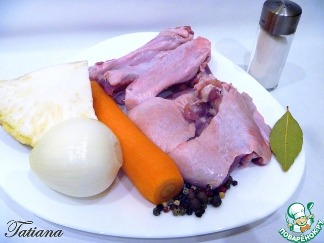 Утиное мясо хорошо промойте, поместите в кастрюлю (2,5 литра), влейте холодную воду (~1,7-1,8 литра), доведите до кипения, снимите пену, добавьте целую луковицу, половинку моркови и корневой сельдерей порежьте крупно-добавьте к мясу. Варите на медленном нагреве под крышкой ~ 1 час. Затем бульон посолите (1 ч. л.), добавьте щепотку перца, варите еще минут 30. Готовый бульон процедите, мясо отделите от костей.