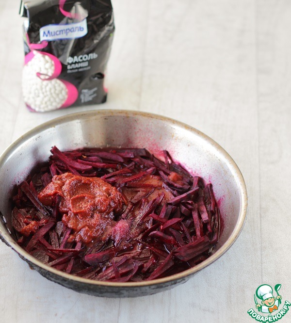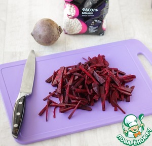 Пока варится фасоль, свёклу желательно нарезать соломкой или же натереть на терке.