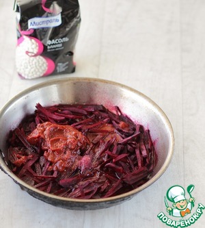 В сковороду налить немного воды, выложить свёклу и поставить на огонь тушиться, в процессе добавить томатную пасту, сахар, щепотку соли, лимонную кислоту и тушить на медленном огне до готовности.