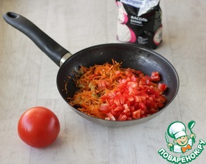 В другой сковороде разогреть растительное масло и обжарить нарезанный лук до прозрачности, добавить морковь, продолжить тушить до мягкости моркови.