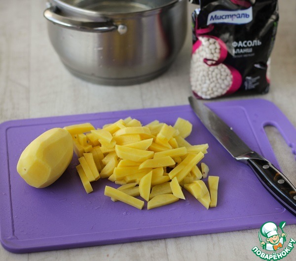 Фасоль бланш белую мелкую от Мистраль залить на ночь водой. Эта фасоль имеет сливочный нежный вкус и рассыпчатую структуру, она создаст основу горячему свекольнику. Вымоченную фасоль промыть, залить водой и поставить варить.
