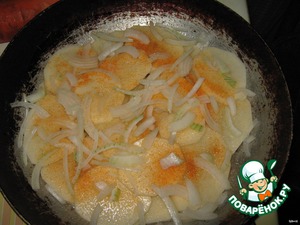 Картофель режем кружочками, толщиной 3-5 мм, лук полукольцами.