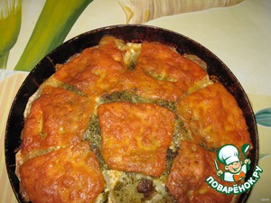 Ставим в духовку при температуре 190 градусов, за 10-15 минут до готовности посыпаем тертым сыром, или выкладываем поверх блюда дольки сыра (как у меня).