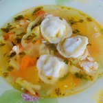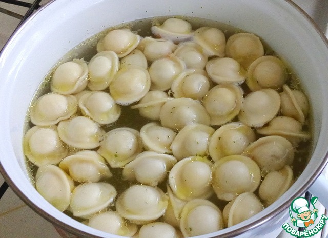 Поставить на огонь кастрюлю с бульоном, дать закипеть. В кипящий бульон выложить готовые пельмени, после всплытия варить до полуготовности. Мои варятся 12 минут, и я уверена, что они не разварятся, вы смотрите по своим. Если не уверены, лучше их тогда добавить в суп в конце варки.