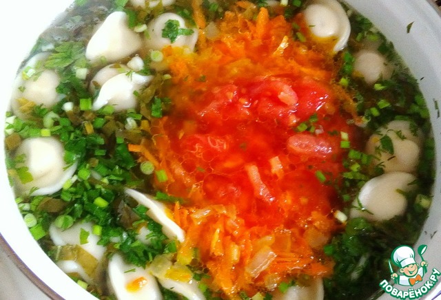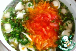 Выкладываем в суп обжаренные лук с морковью и нарезанные помидоры.