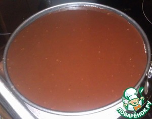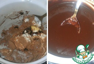 Примерно через час, можно приготовить глазурь. В этот раз я использовала глазурь: масло, сметана, какао, сахар, все довести до кипения на среднем огне, подождать пока разойдется сахар. Снять с огня и добавить желатин (заранее залить водой и оставить минут на 10-15). Так же можно использовать другую глазурь: шоколад 100гр, масло 60 гр. растопить на среднем огне.