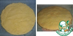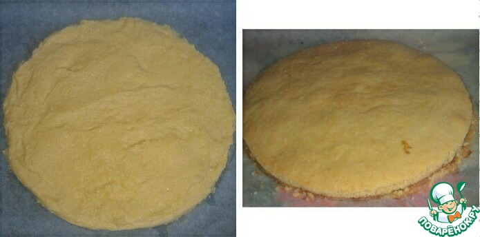 На пергаменте необходимо нарисовать круг ( у меня диаметр 20). После чего распределить тесто по кругу и отправить в заранее разогретую до 180°духовку на 12-13 минут. Корж получится песочный, но при этом очень мягкий. Обрезать корж, что бы он был ровный и подходил по размеру в форму.