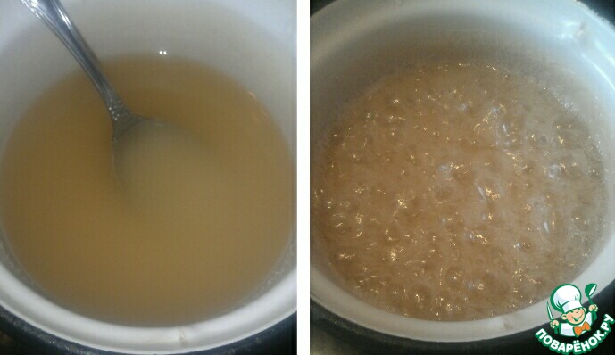 Суфле: смешать сахар, воду, агар и поставить на средний огонь, как только смесь начнет кипеть, будет очень много пены. Варить до 110°-112°, если нет термометра, готовность проверяют на твёрдый шарик и тонкую нить с лопатки.