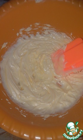 Корж: смешать масло комнатной температуры с сахаром, затем ввести по одному желтку, после того как масса станет однородной добавить муку и разрыхлитель.