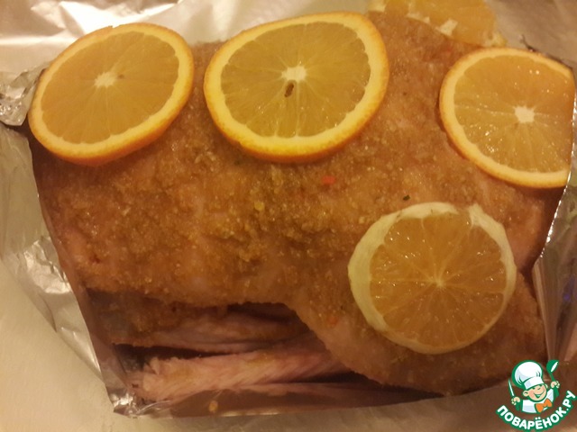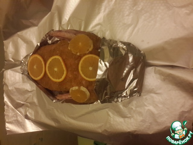 Далее нужно со всех сторон промазать гуся маринадом, разложить по нему кружочки апельсина, упаковать в фольгу и отправить в холодильник мариноваться ( желательно на ночь- сутки).