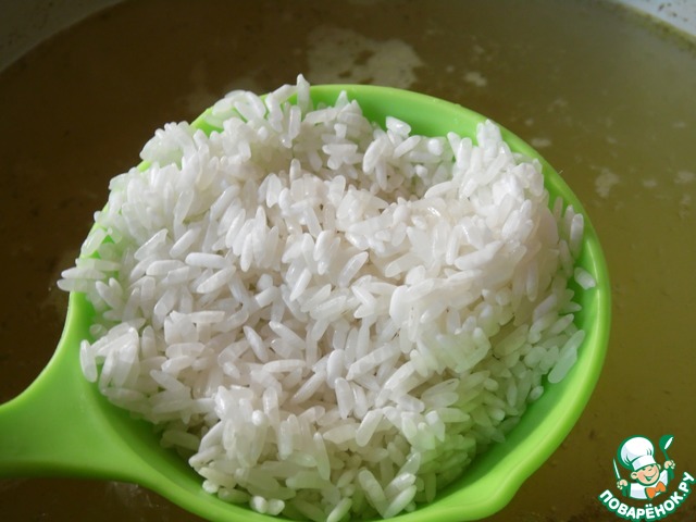 Бульон довести до кипения, выложить в него рис, варить 15 минут.