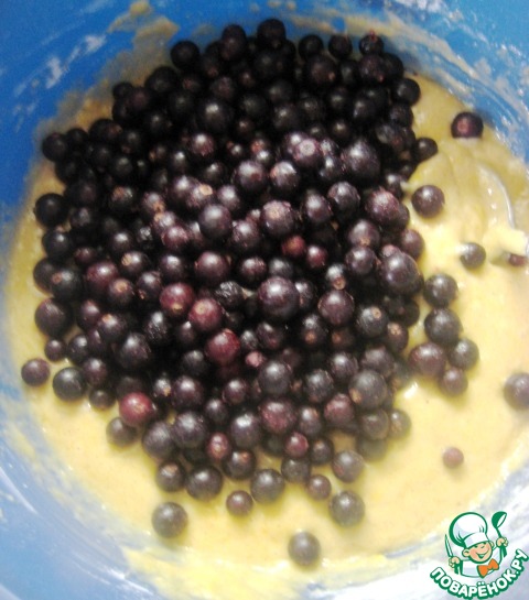Всыпать замороженную черную смородину (предварительно размораживать ягоду не нужно), аккуратно перемешать.
