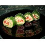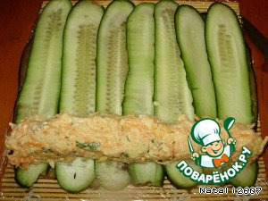 Сверху, на баклажаны, кладем тоненькие огурцы и начинку и свернуть в рулет.