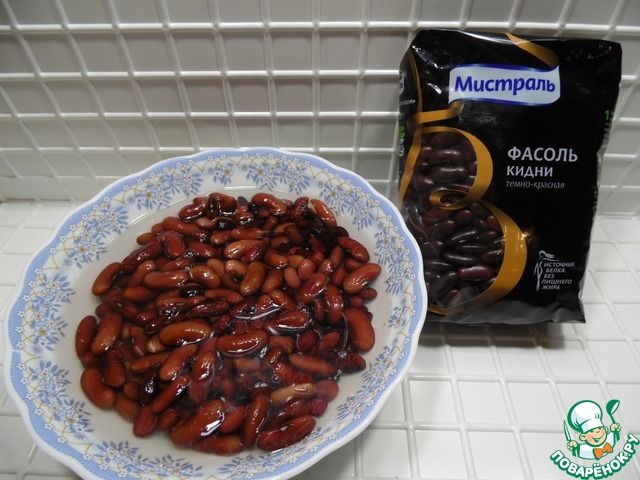 Фасоль залить холодной водой, оставить на 5-6 часов. Затем воду слить, фасоль выложить в бульон, варить 40 минут.