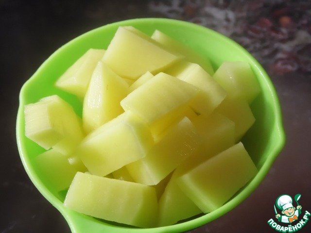 Картофель нарезать небольшими кубиками, выложить в суп, варить 15 минут.
