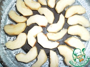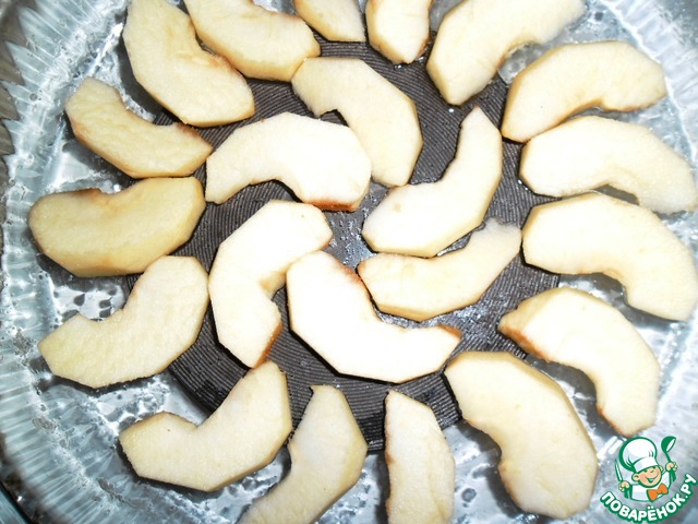 Яблоки очистить, нарезать дольками и выложить на промасленное дно тёплой формы.
