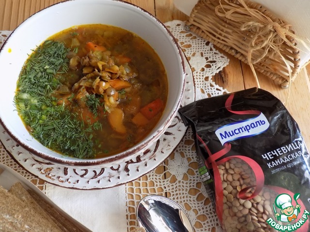 • Для супа выбрала чечевицу канадскую ТМ МИСТРАЛЬ. На упаковке написано, что она не требует замачивания и варится 15-20 минут. Меня это очень устроило.