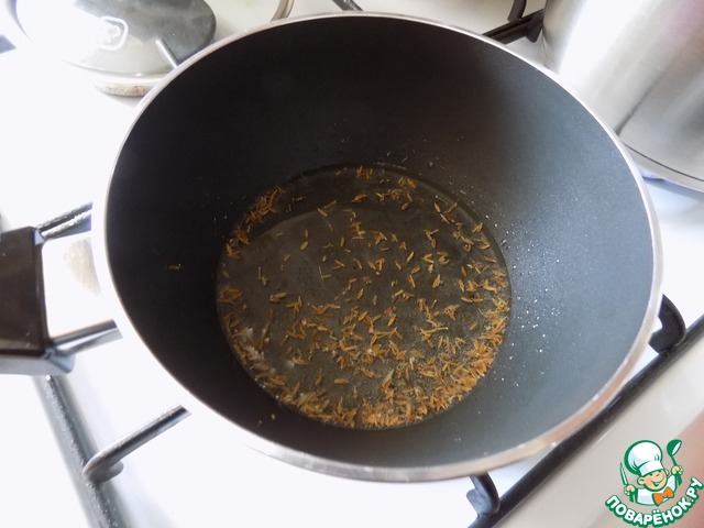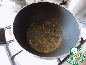 • Вода в кастрюле с чечевицей закипела, я убавила огонь на минимум, накрыла кастрюлю крышкой и оставила вариться, параллельно занялась заправкой для супа. В сотейник выложила зиру, чуть её обжарила, чтобы она раскрыла свой аромат и налила масло.