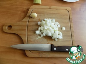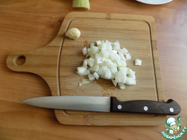 • Чеснок дольку почистила и раздавила плоской стороной ножа. Отправила к зире. Обжарила 1 минуту в масле, чтобы он отдал свой аромат маслу и удалила из сотейника. Выложила лук мелко резанный. Лук позолотила.