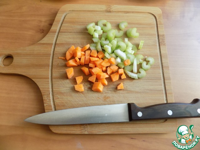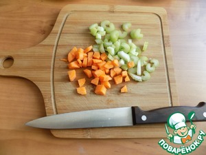 • Далее очередь сельдерея и половины моркови, которые я порезала мелко. Накрыла сотейник крышкой, убавила огонь на минимум и оставила томится.
