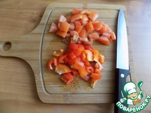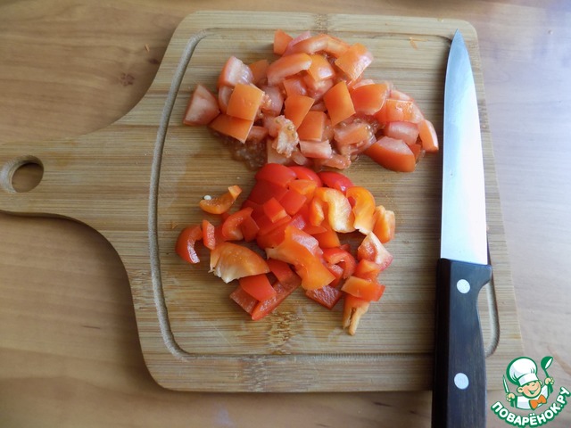 • Через 2 минуты-перец болгарский с помидором, порезанные тоже мелко.