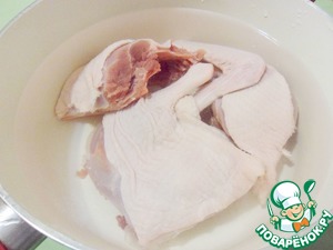 Тушку утки разделить на куски, залить водой, довести до кипения и варить в течение 40 минут, периодически снимая появляющийся жир.