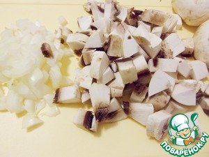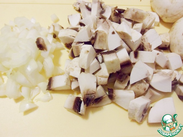 Репчатый лук очистить и мелко нарезать. Шампиньоны обработать и нарезать кусочками.