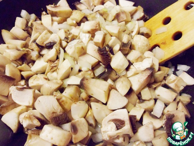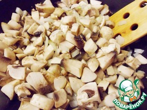 Обжарить на сковороде лук и шампиньоны с добавлением ложки растительного масла в течение 5-7 минут, пока не испариться влага от грибов.