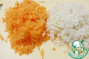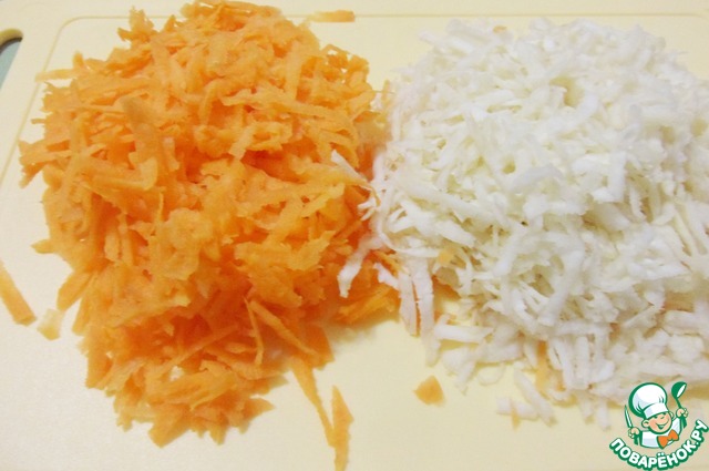 Очищенные морковь и корневой сельдерей натереть на крупной терке.