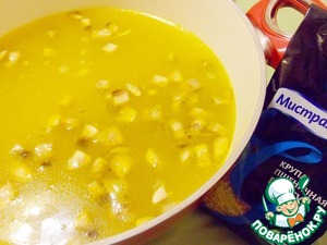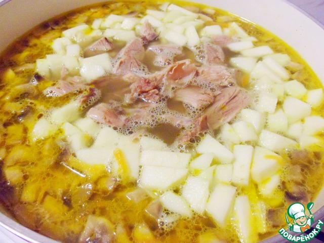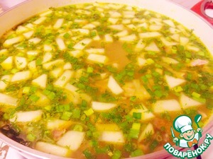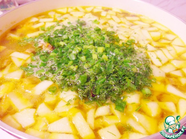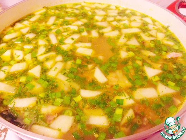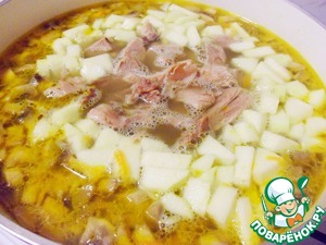Очищенный и нарезанный кубиками картофель положить в суп и варить около 10 минут.