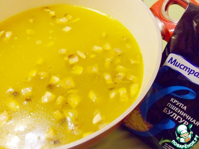 Процеженный бульон довести до кипения, положить обжаренные овощи и грибы, добавить булгур, тмин и варить около 5 минут.