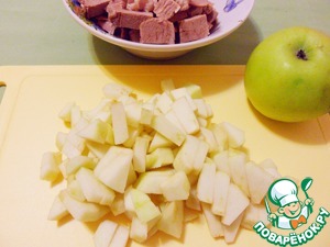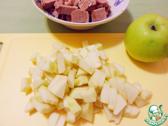 Утиное филе отделить от костей, нарезать кусочками. Яблоки и кусочки филе утки положить в кастрюлю и варить 5 минут.
