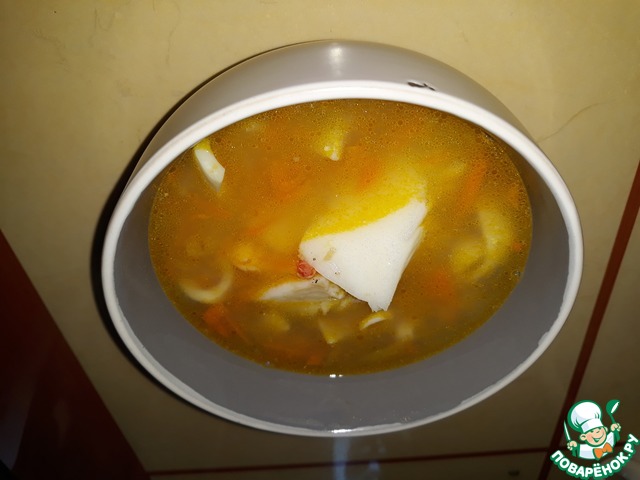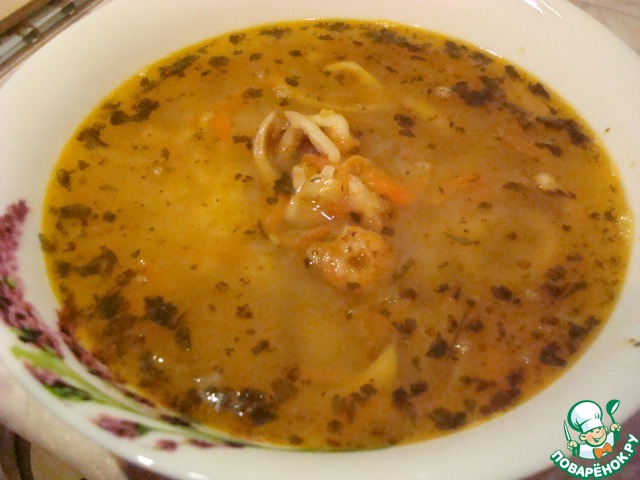 В готовый суп выложить полоски кальмаров, довести до кипения и убрать с огня, дать постоять под крышкой 5 минут (не надо кипятить кальмаров дольше, так они будут мягкими и вкусными).