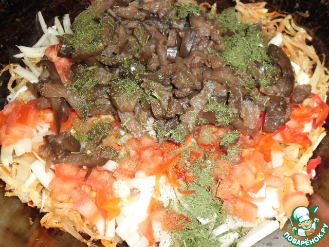 баклажаны, жгучий перец и рубленную зелень. Перемешать, протушить под крышкой 5-7 минут.