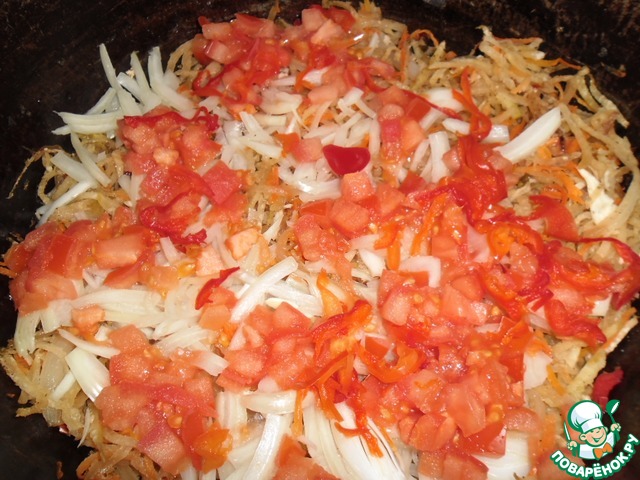 Теперь добавить болгарский перец, помидоры кубиком и маринованный лук, -