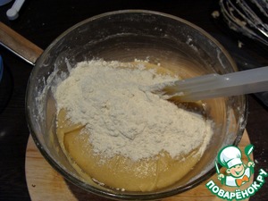 Просеиваем сухие ингредиенты и добавляем в несколько заходов к жидким. Перемешиваем все лопаткой до полного соединения всех ингредиентов, не усердствуйте слишком. Нам нужно тесто без сильной клейковины, поэтому долго и усердно не мешаем, только всё смешалось и всё, закончили.
