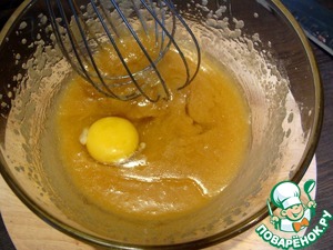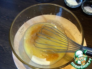 В миске смешиваем растопленное масло комнатной температуры и сахар - белый и коричневый. Смешиваем венчиком, пары минут будет достаточно. Нам не нужно взбивать тесто, поэтому миксер не используем. Мешаем, пока масса не станет немного густой.