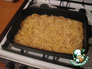 Сыр потереть на крупной терке, посыпать сверху запеканку, и залить все пачкой майонеза. Накрыть форму фольгой. Поставить в разогретую духовку на 40 минут при 180*С.