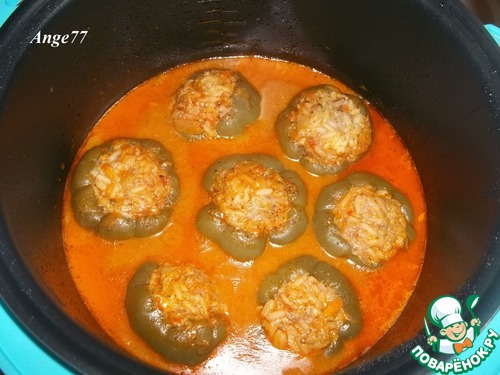 7) Выложить в закипающий соус перцы, закрыть крышку (Внимание, количество соуса должно быть почти на уровне перцев, если нужно, добавить немного воды). Тушить до окончания программы, иногда заглядывая и слегка передвигая перцы лопаточкой и поливая перцы соусом.